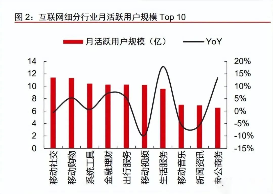 國內(nèi)互聯(lián)網(wǎng)滲透率已達較高水平,流量紅利基本見頂。根據(jù) Questmobile,截至 2022 年 12 月,中國移動互聯(lián)網(wǎng)月活躍用戶規(guī)模達到 12.03 億,根據(jù)第七次人口普查數(shù)據(jù),我國 10-79 歲人口約 12.09 億,互聯(lián)網(wǎng)用戶滲透率已達較高水平。2022 年 6 月,移動社交/ 移動購物/系統(tǒng)工 App MAU 分別達 11.43/11.36/10.45 億(Questmobile),騰訊系/頭條系/阿里系/百度系 App 滲透率分別達98.6%/89.5%/96.2%/91.8%(月狐數(shù)據(jù)),頭部平臺滲透率接近天花板,流量紅利基本見頂。